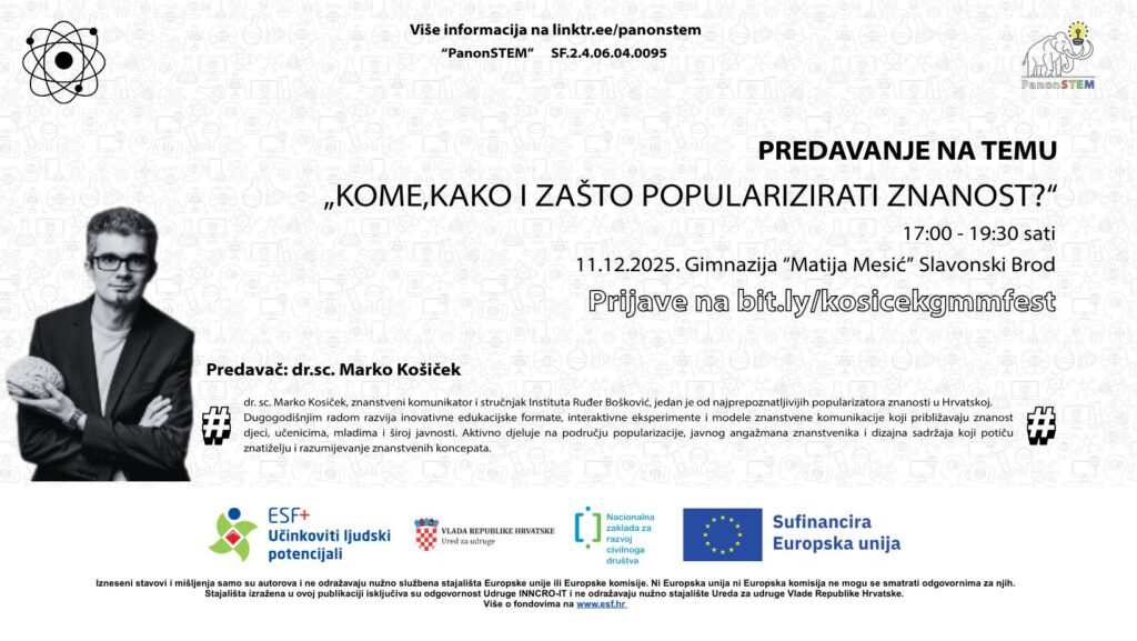 Gimnazija „Matija Mesić“ s ponosom najavljuje organizaciju stručnog predavanja jednog od najpoznatijih hrvatskih popularizatora znanosti, dr. sc. Marka Kosičeka iz Instituta Ruđer Bošković, koje će se održati u sklopu GMM FEST(IVAL)-a 2025.
