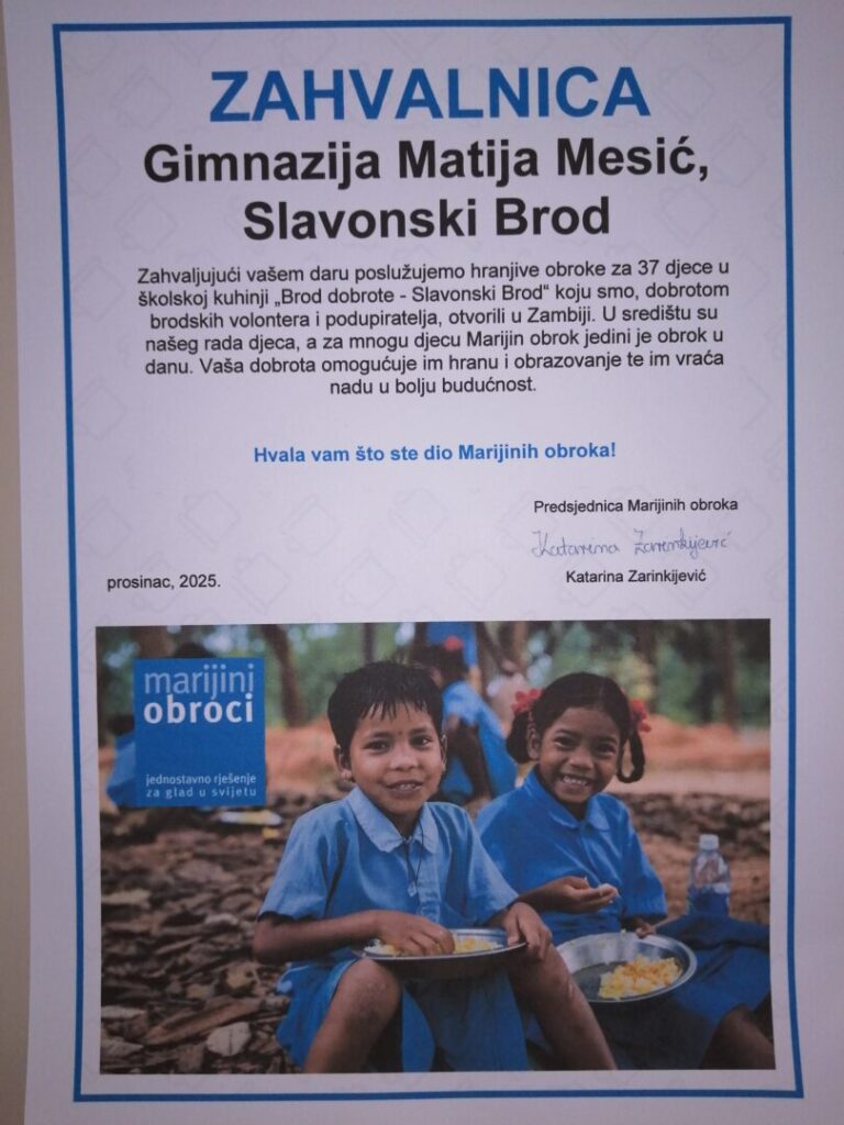 Volonterski klub “Carpe diem” Gimnazije “Matija Mesić” ponosan je na sve učenike škole jer su u prosincu 2025. godine podržali božićnu akciju “Jedan razred-jedno dijete”. Inicijator akcije je profesorice Mihaela Šebalj Zavor. Svaki je razred donirao 22 eura za Marijine obroke jer je toliko potrebno da se jednom djetetu u Africi omogući jedan dnevni obrok u godini dana, a često im je to i jedini obrok u danu. Posebnu zahvalu zaslužuju učenici koji su samostalno donirali cijeli iznos potreban za prehranu jednoga djeteta, a to su: Vanesa Lišćuk iz 1. F razreda; Josip Opačak iz 1. G razreda; Tea Pasler iz 2. B razreda; Filip Mirosavljević iz 2. G razreda; Ilarija Kraljević iz 3. F razreda i Matea Markulić iz 4. E razreda. Također pohvaljujemo i sve učenike 3. B i 4. E razreda koji su donirali za dva djeteta kao razred. Akcijom su prikupljena sredstva za 37 djece, ali kako humanost nema trajanje, naknadno je jedna učenica uplatila cijeli iznos, stoga povećavamo broj zapisan na Zahvalnici na 38. Gimnazija broji 28 razreda, dva razreda su donirala za dva djeteta, šestero učenika je samostalno doniralo novac, a još dva djeteta su nahranjena dobrotom nekih profesora razrednika. Hvala svim učenicima i profesorima na nesebičnim znakovima ljubavi koji spašavaju živote, a mi se nadamo sljedeće godine premašiti ovogodišnju konačnu brojku 38!