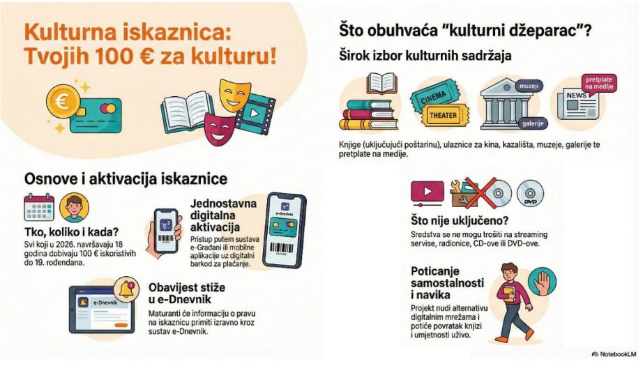 Kulturna iskaznica je vrijednosni kupon u iznosu 100 eura koji dodjeljuje Ministarstvo kulture i medija u suradnji s FINOM. Namijenjena je svima koji u 2026. godini pune 18 godina života (rođeni 2008.godine). Može se koristiti kroz godinu dana za širok izbor kulturnih sadržaja.