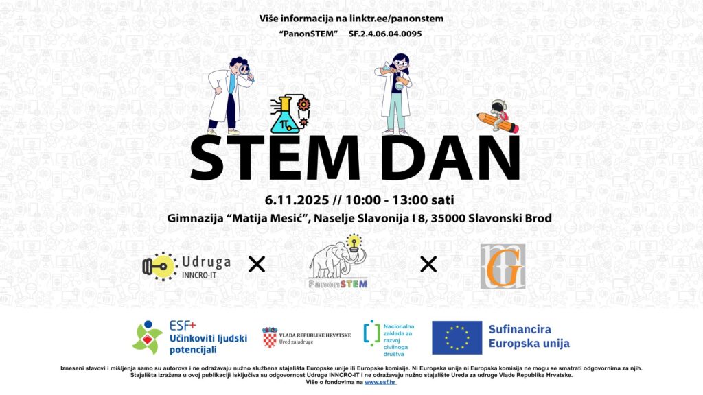 Gimnazija „Matija Mesić“ u suradnji s Udrugom INNCRO-IT i partnerima na projektu „PanonSTEM“ organizira STEM DAN otvoren za javnost, koji će se održati u četvrtak, 6. studenoga 2025. godine, od 10:00 do 13:00 sati u prostoru naše gimnazije (Naselje Slavonija I, br. 8, Slavonski Brod).